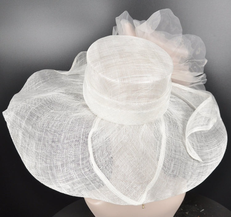 Wide Brim Sinamay Derby Hat: White with Blush Pink Silk Flower