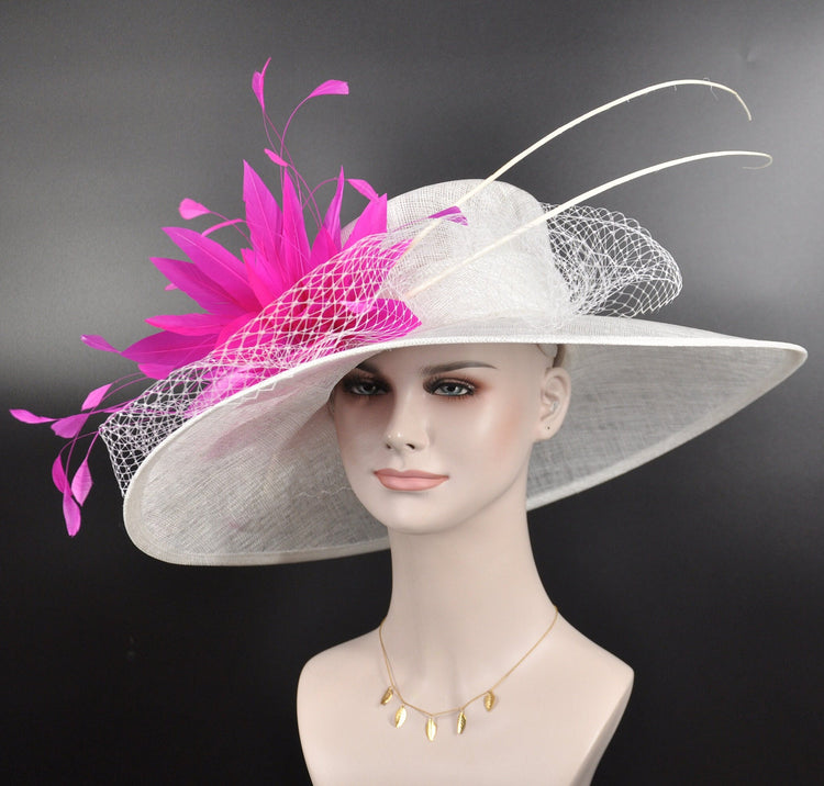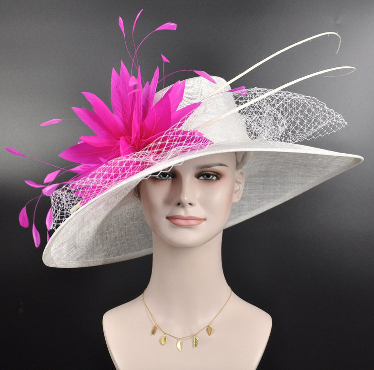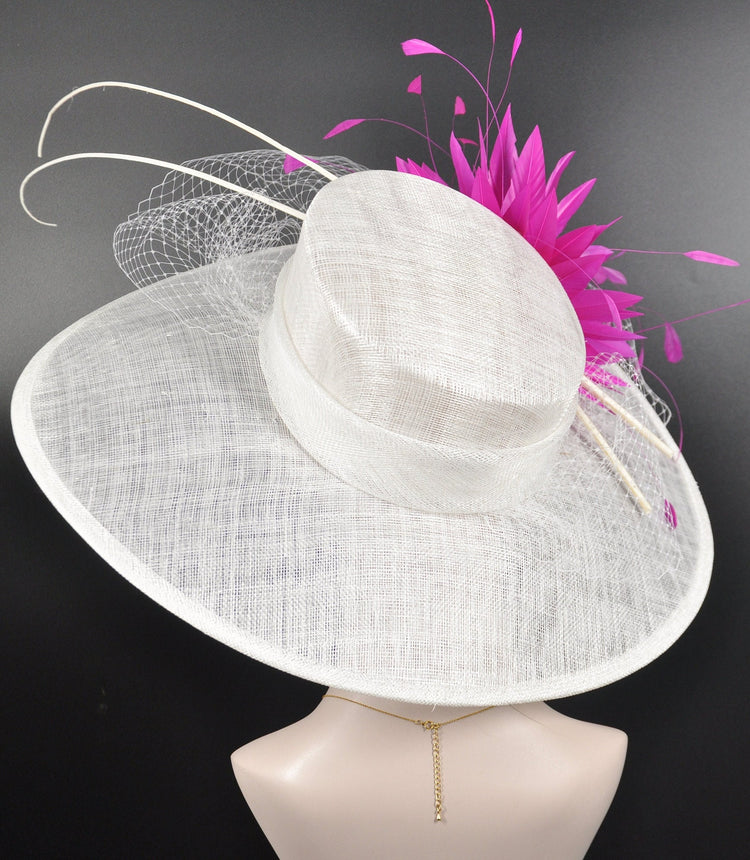 Wide Brim Sinamay Derby Hat: White with Fuchsia Flower