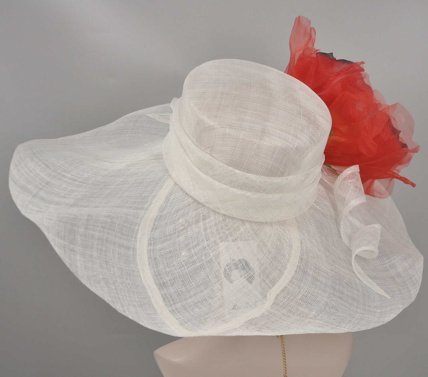 Wide Brim Sinamay Derby Hat: White with Red Silk Flower