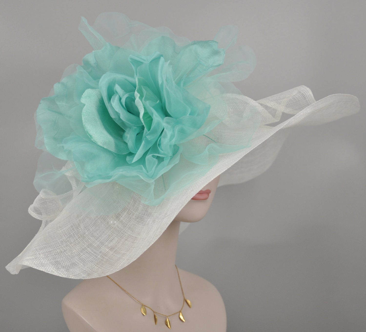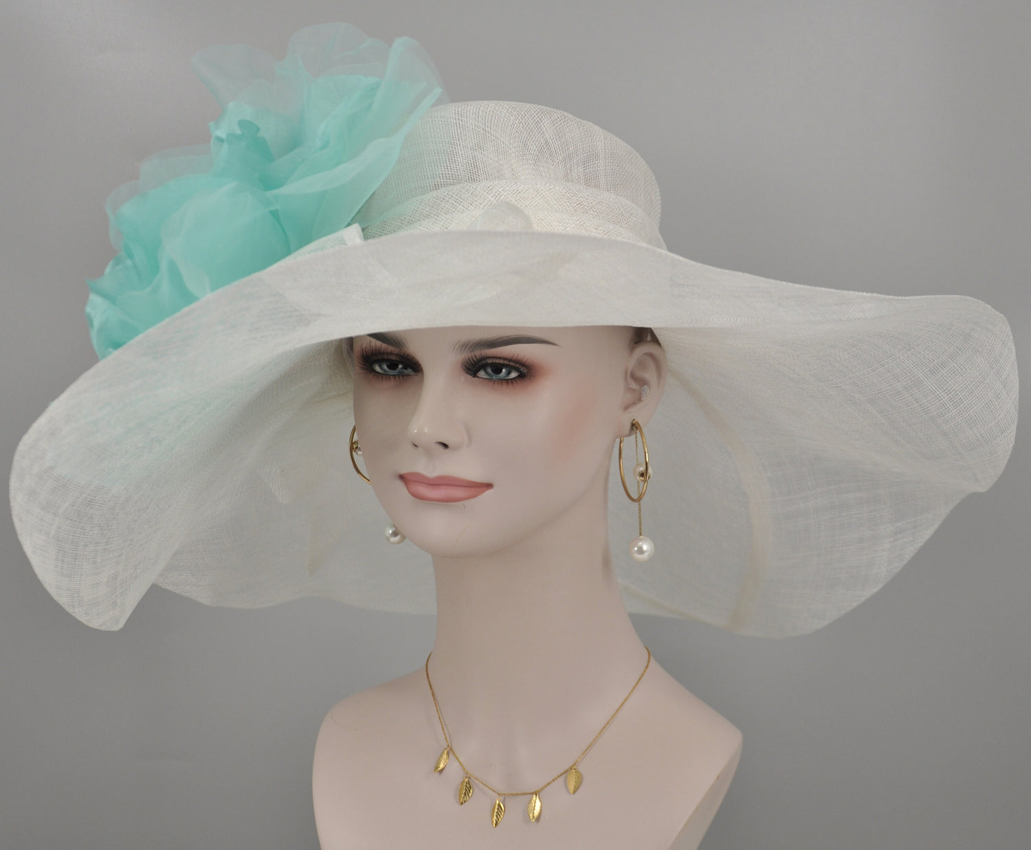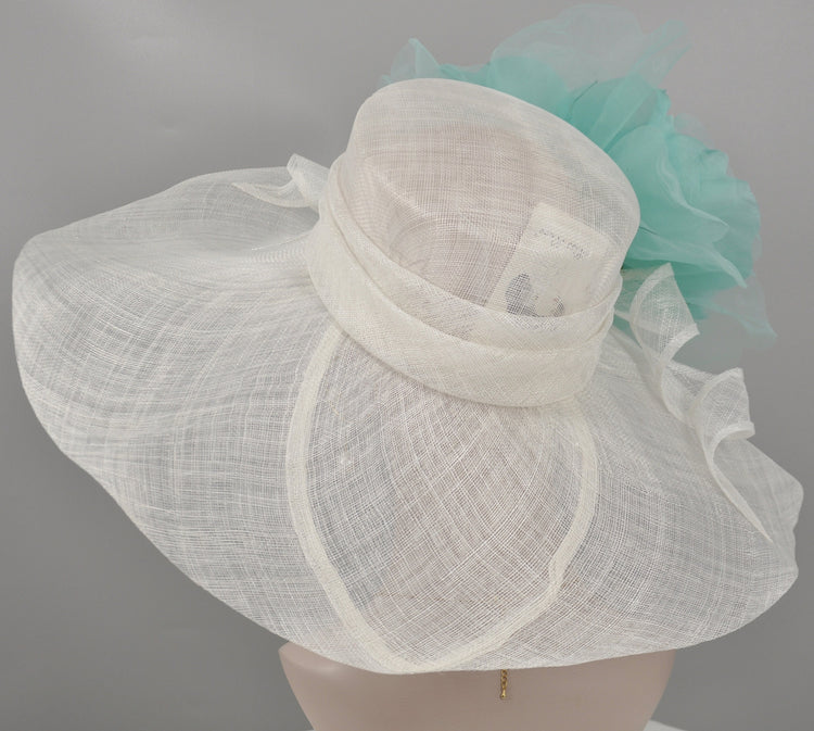 Wide Brim Sinamay Derby Hat: White with Turquoise Silk Flower