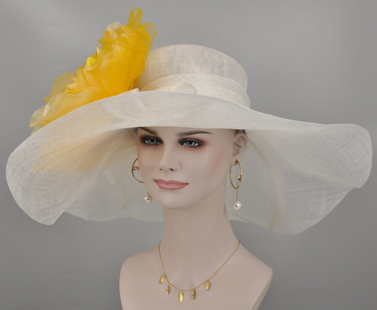 Wide Brim Sinamay Derby Hat with Lemon Yellow Silk Flower