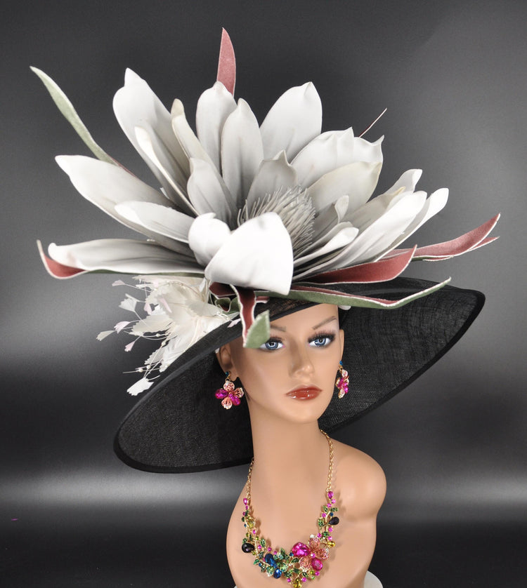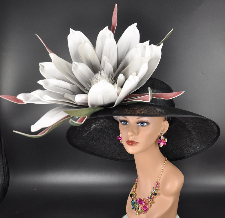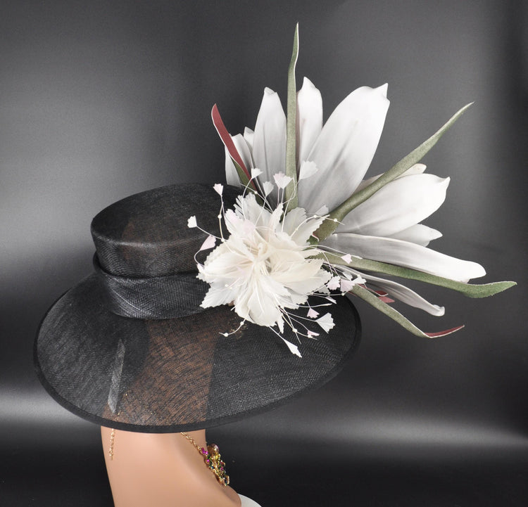 Wide Brim Sinamay Hat Church Kentucky Derby Hat Carriage Tea Party Wedding Hat Feather Flower Foam Jumbo Flower Black Gray Ivory Pink