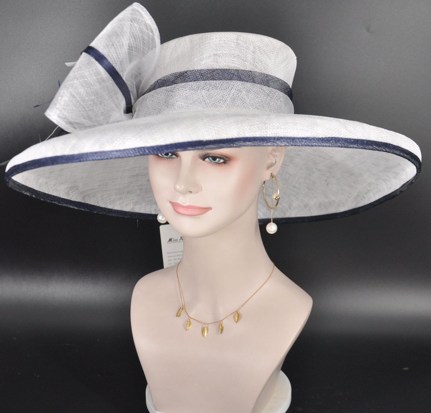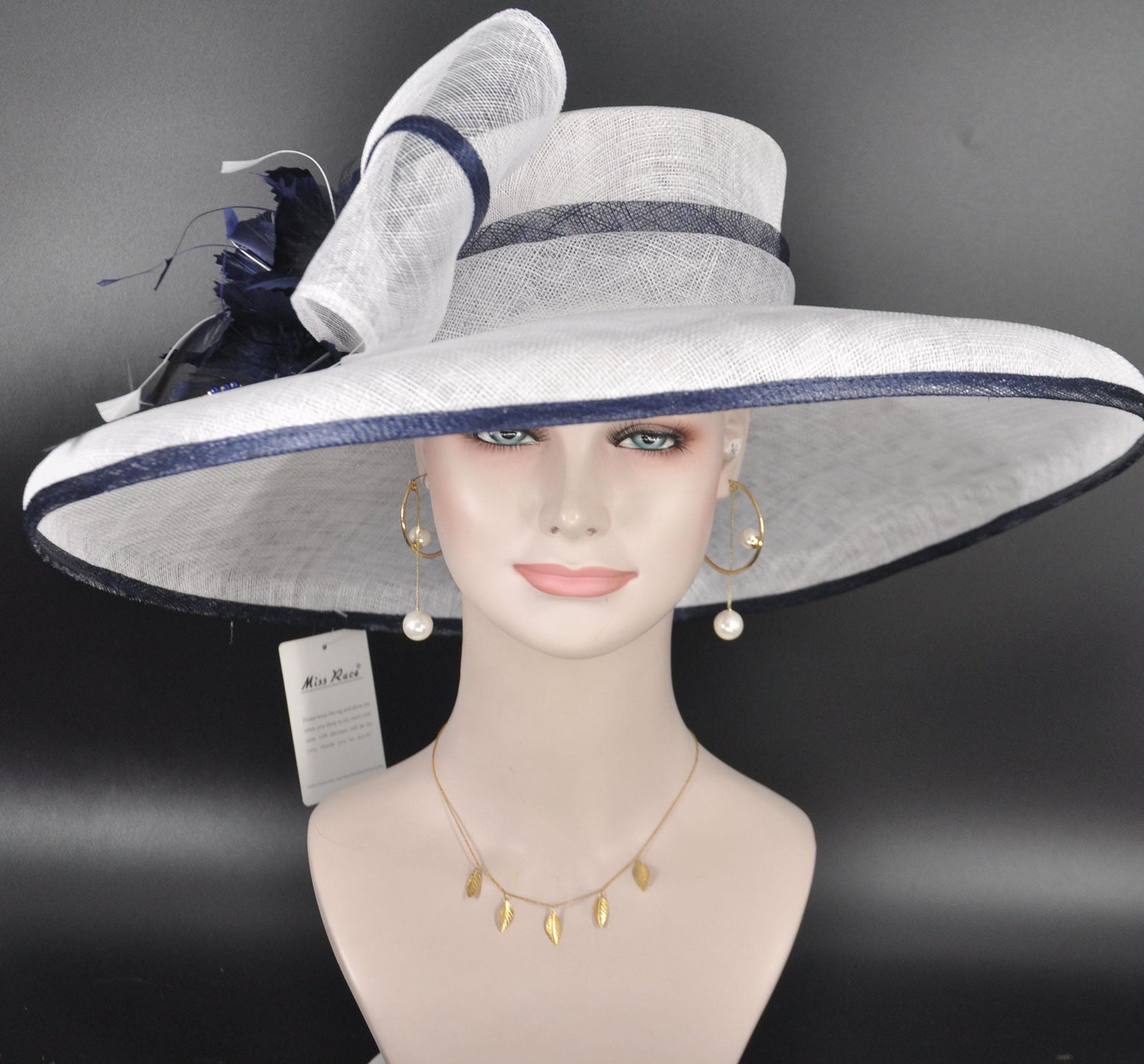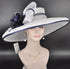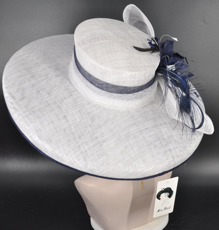 Wide Brim Sinamay Hat: White & Navy Feather Headpiece