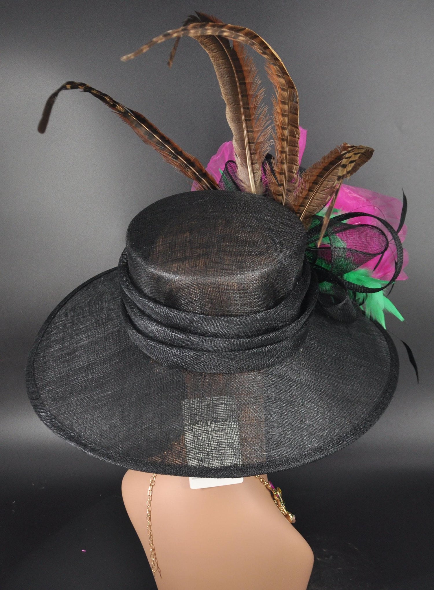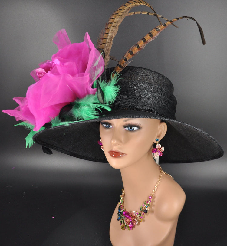 Wide Brim Sinamay Kentucky Derby Hat: Black, Green, Fuchsia, Pink