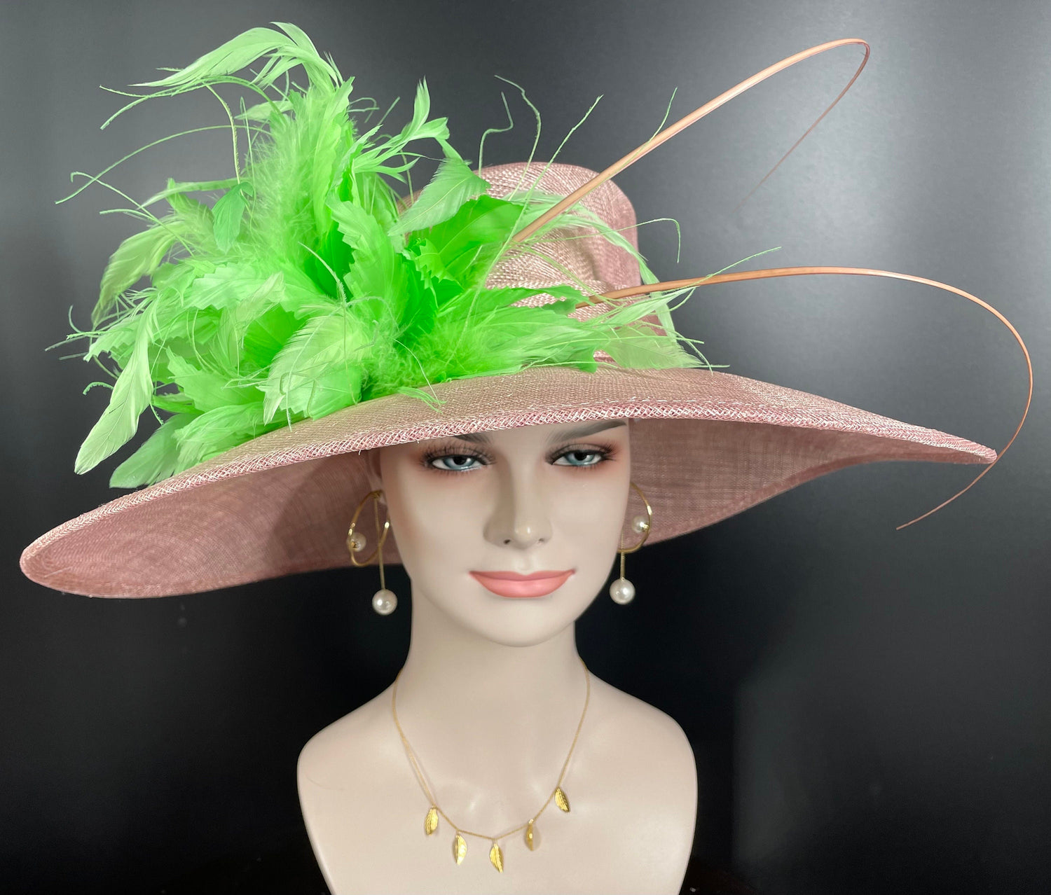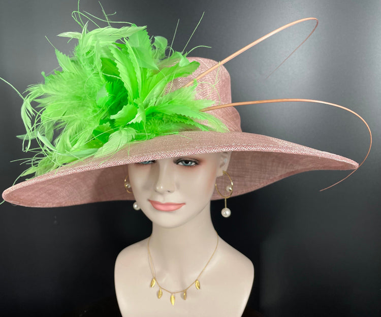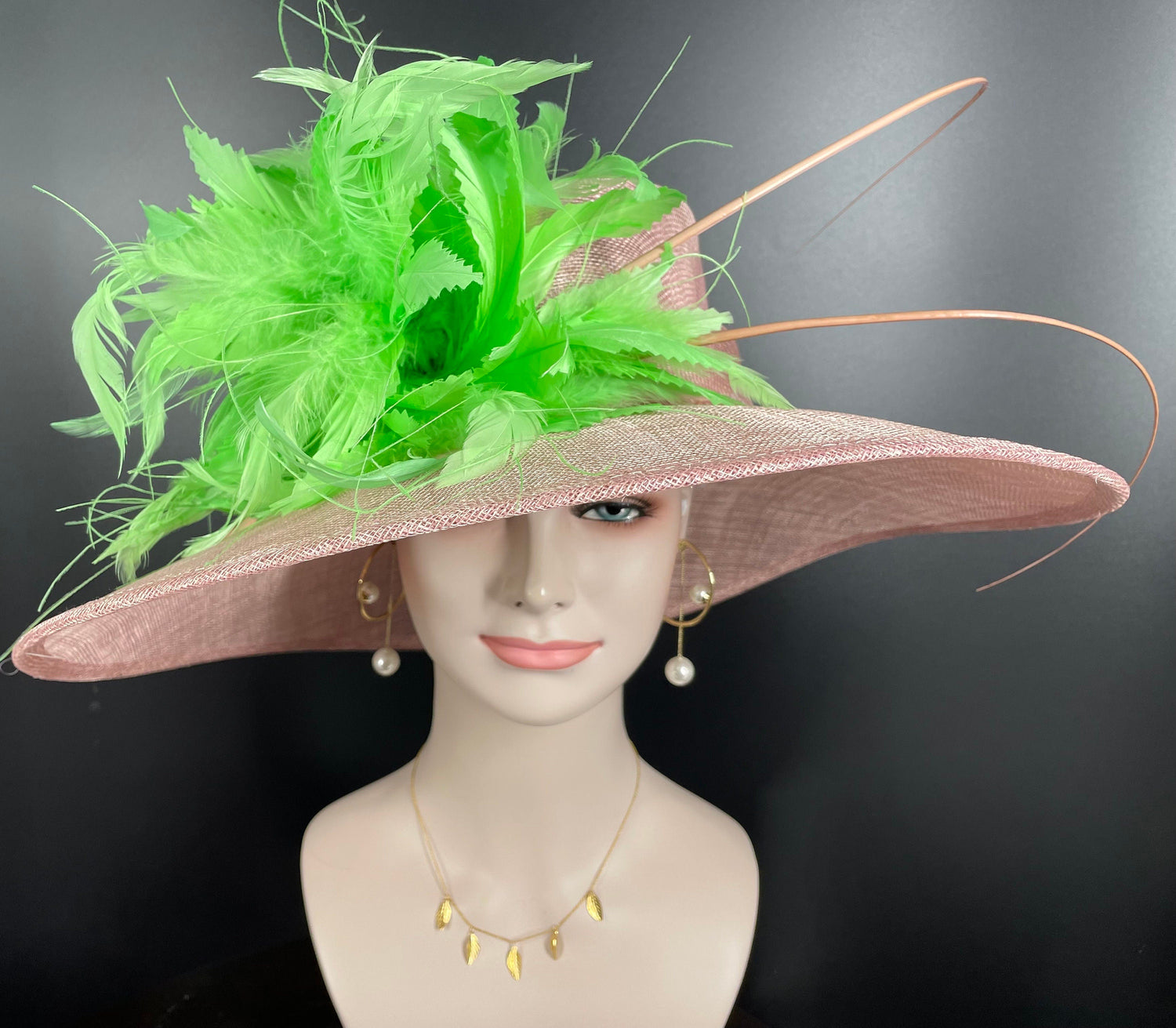Wide Brim Sinamay Kentucky Derby Hat: Blush Pink Feather Flower