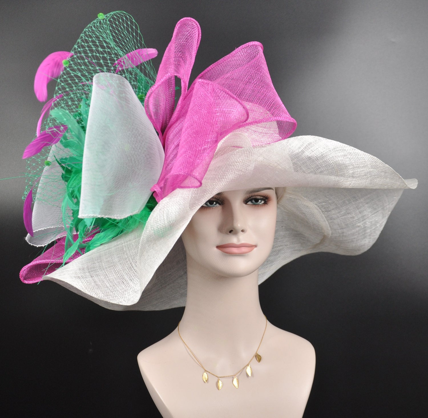 Wide Brim Sinamay Kentucky Derby Hat: Fuchsia, Pink & Green