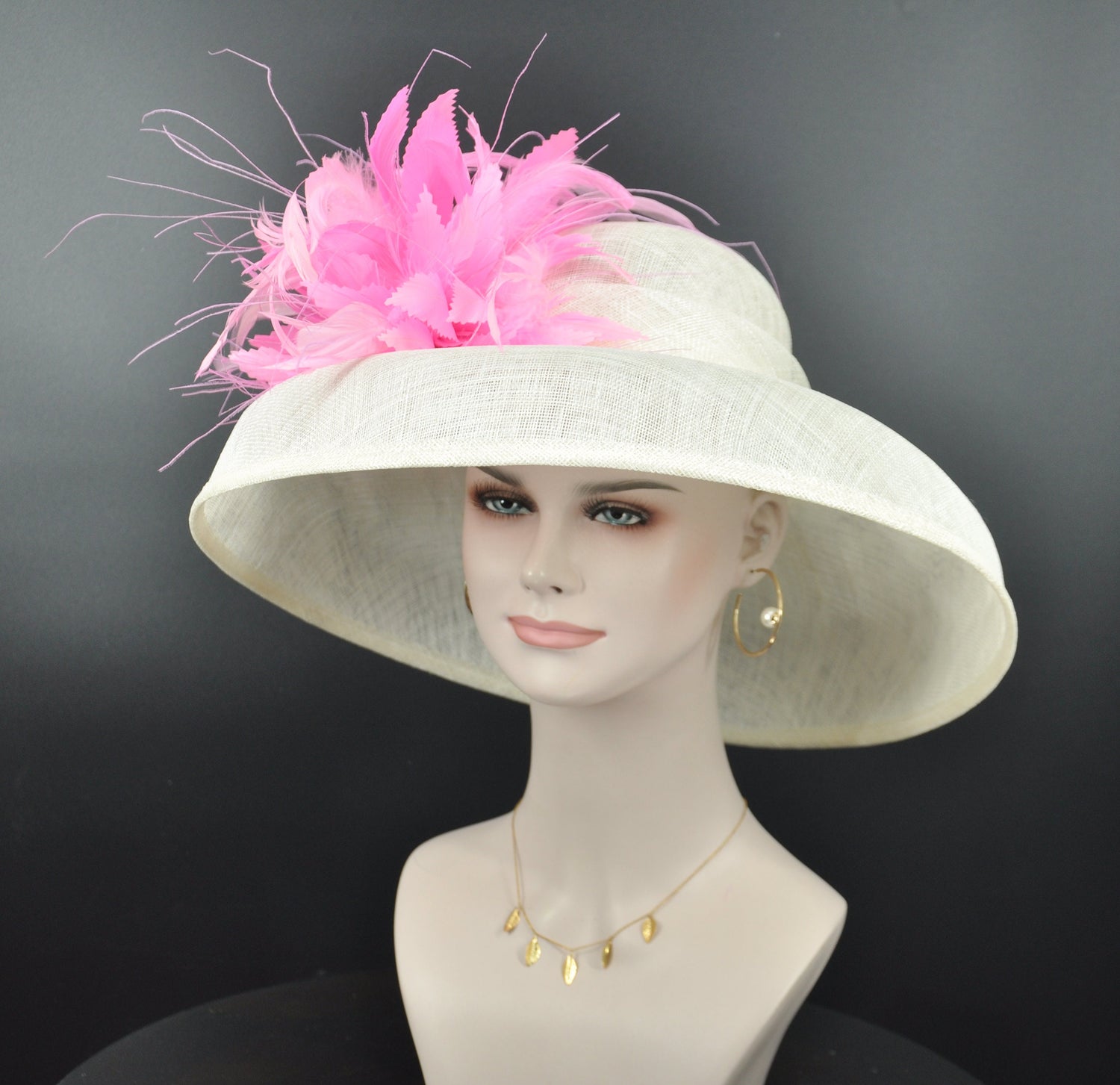 Wide Brim Sinamay Kentucky Derby Hat: Ivory & Pink Feather Dome