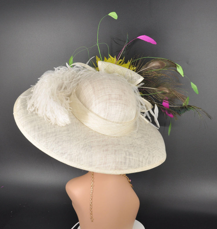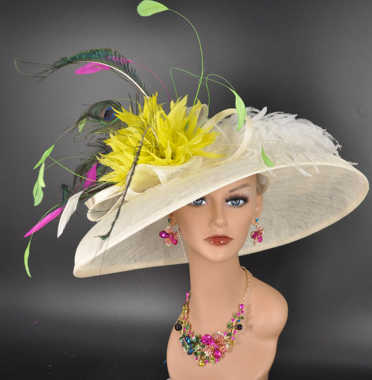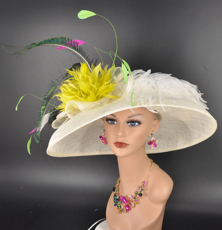 Wide Brim Sinamay Kentucky Derby Hat: Ivory, Yellow, & Peacock Feather