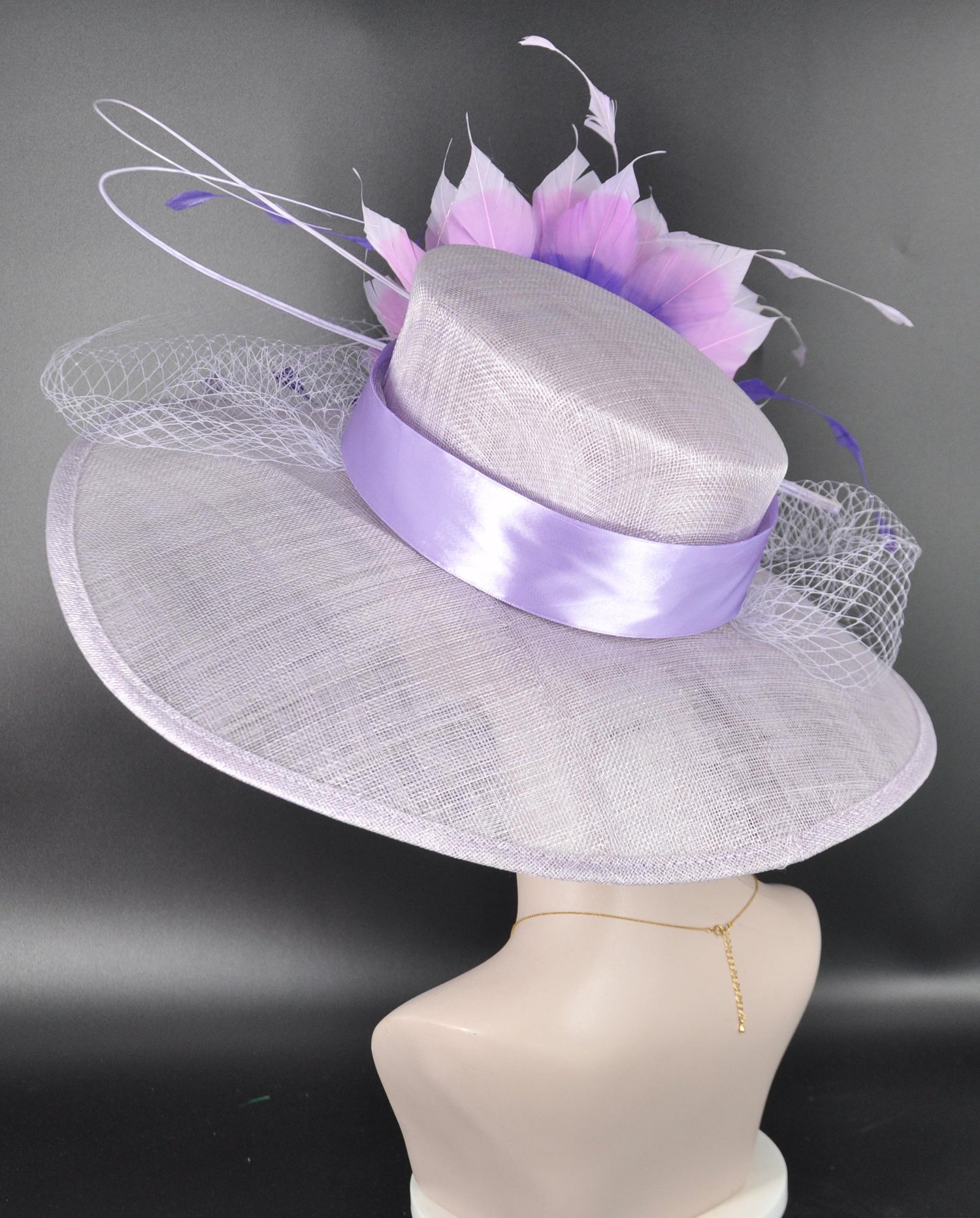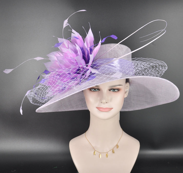 Wide Brim Sinamay Kentucky Derby Hat: Lilac Feather Flower