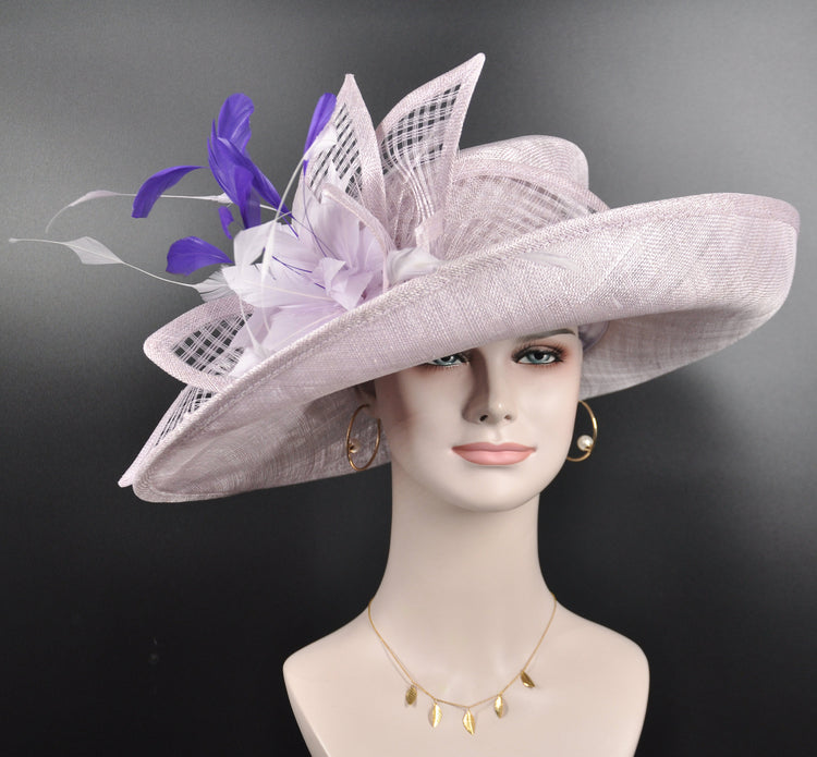 Wide Brim Sinamay Kentucky Derby Hat: Lilac & Purple Feathered Tea Party Hat