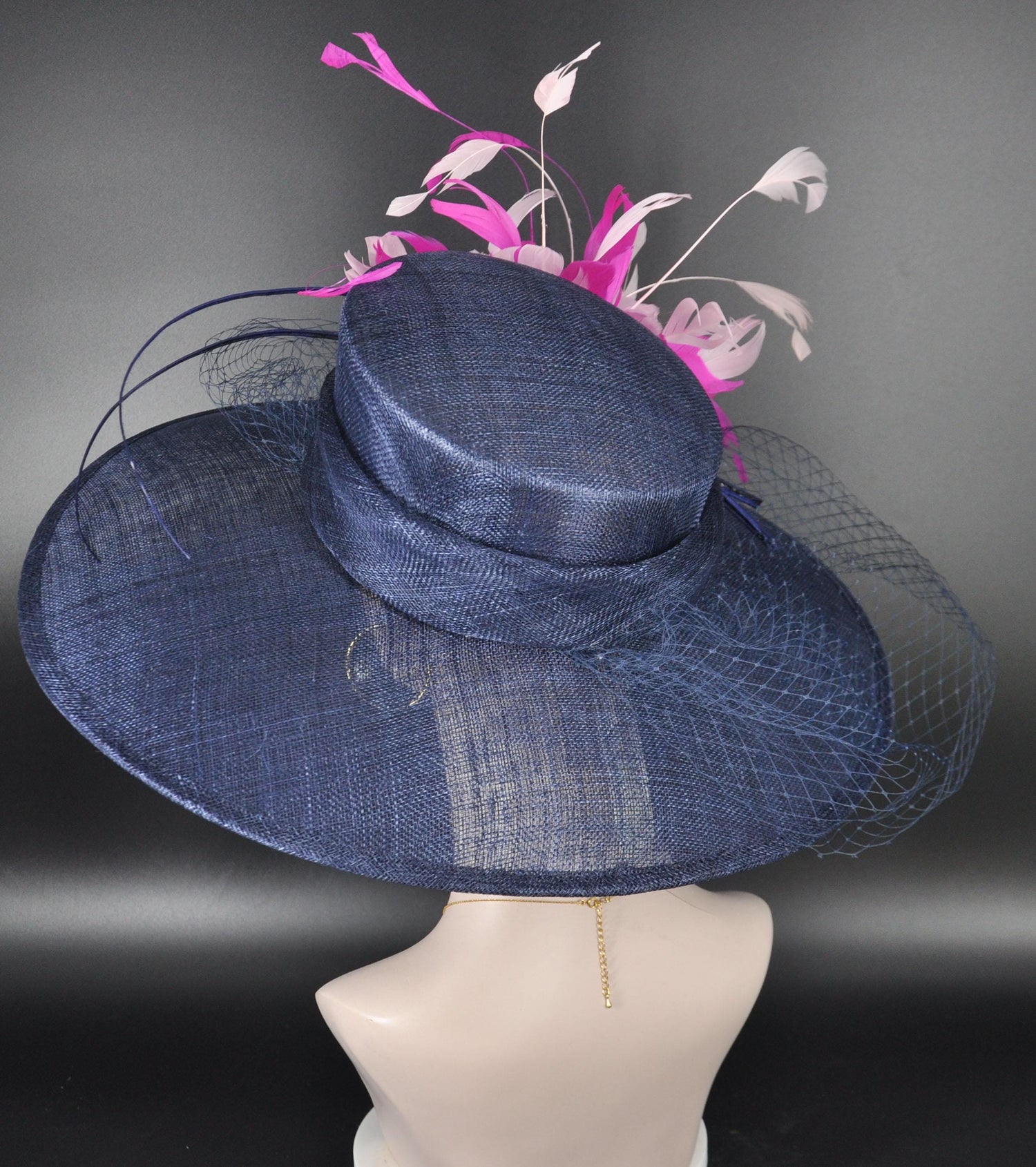 Wide Brim Sinamay Kentucky Derby Hat: Navy Blue & Fuchsia Pink