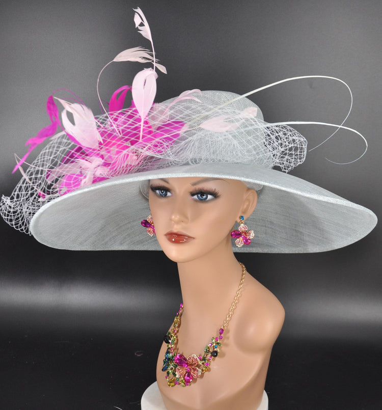 Wide Brim Sinamay Kentucky Derby Hat: Powder Blue & Fuchsia Feather Flower