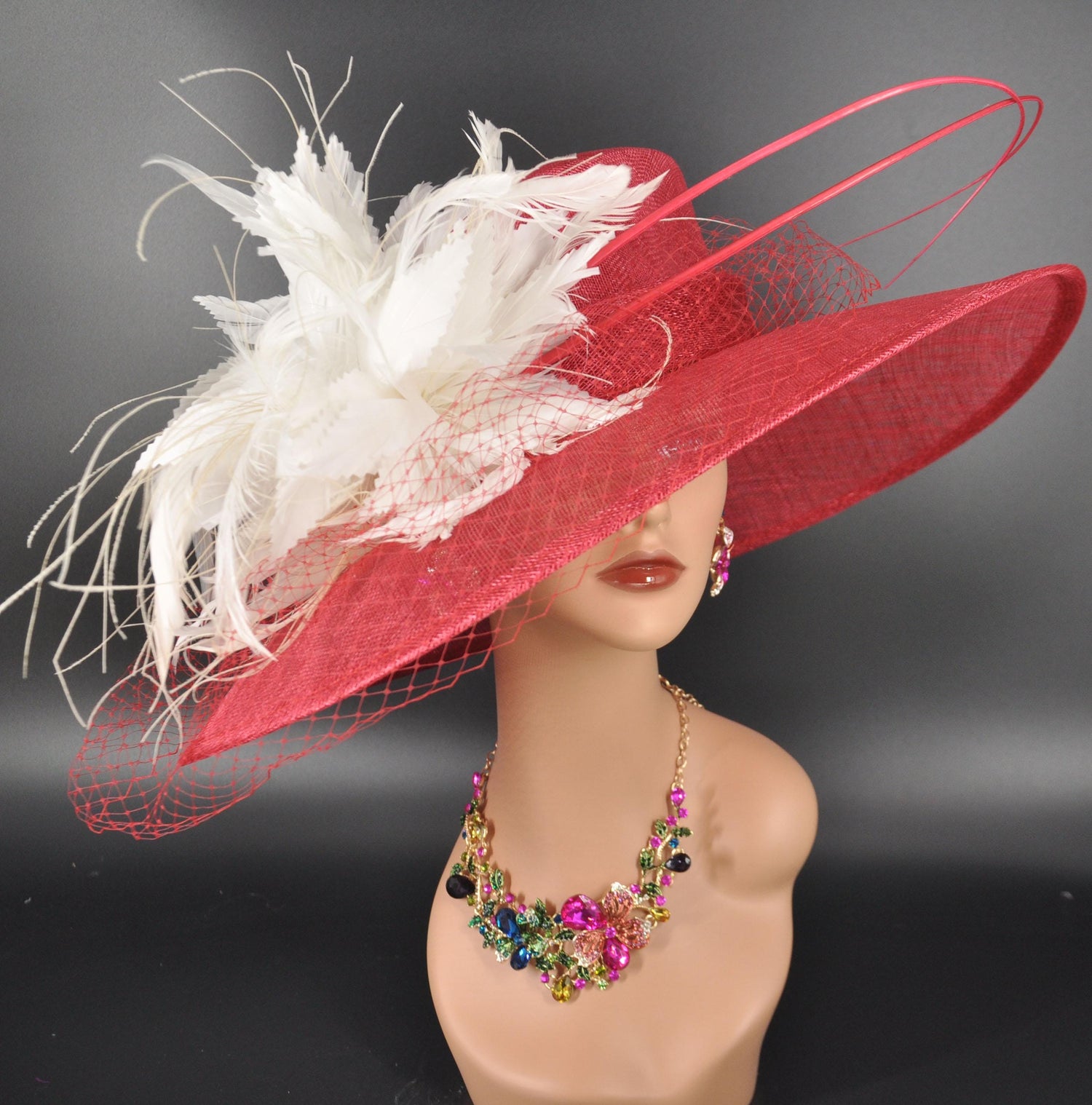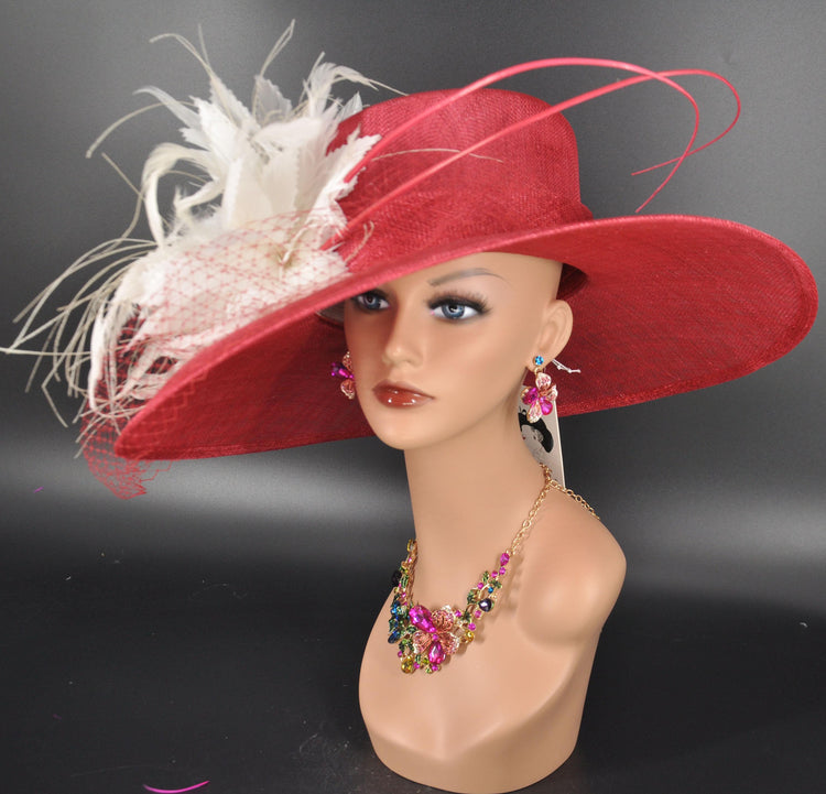 Wide Brim Sinamay Kentucky Derby Hat: Red & White Feather Flower