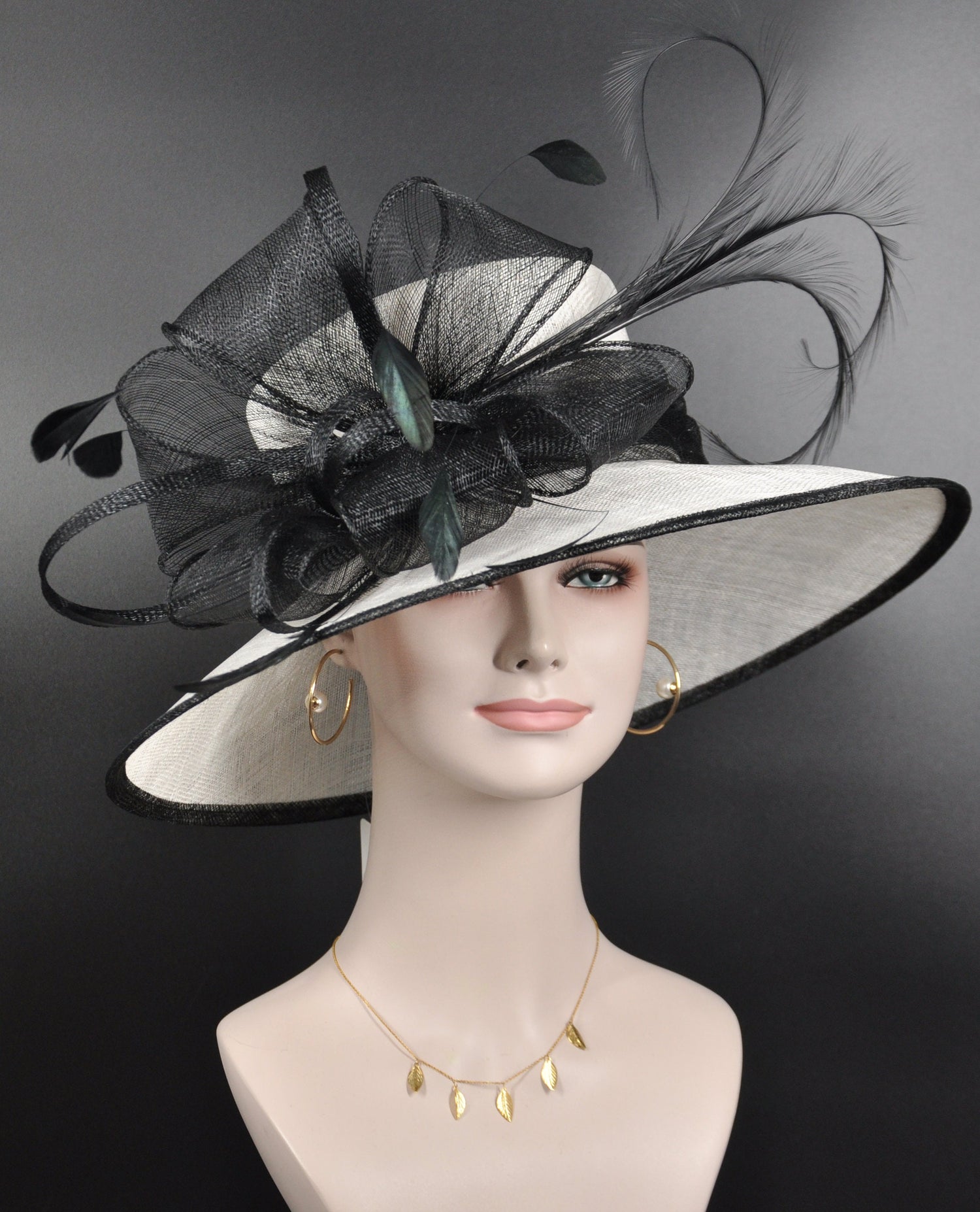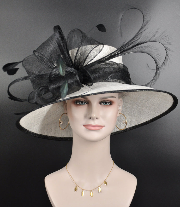 Wide Brim Sinamay Kentucky Derby Hat: White & Black Feathered Tea Party Hat
