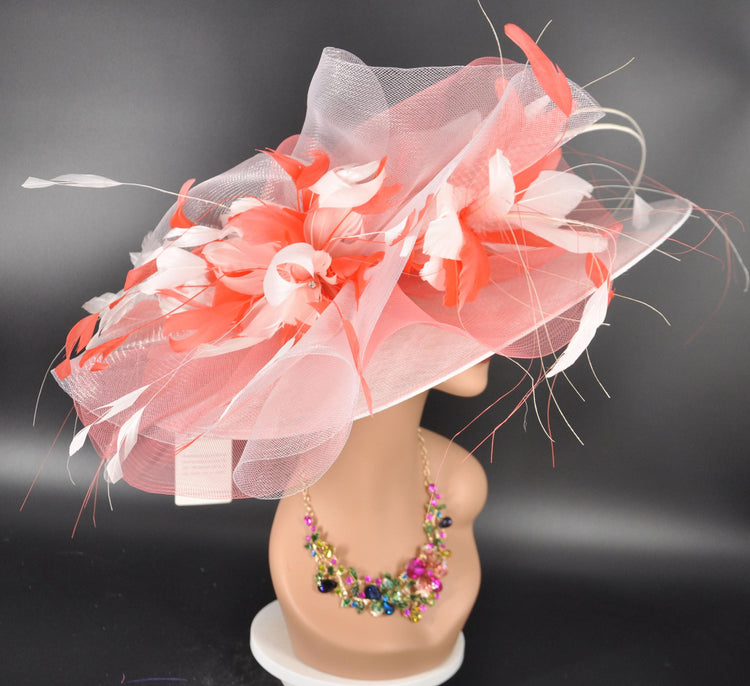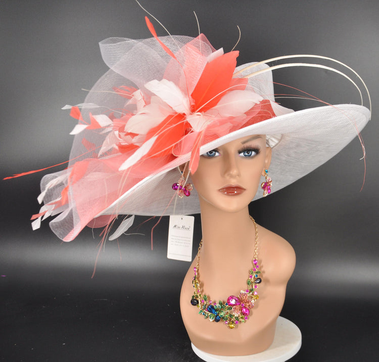 Wide Brim Sinamay Kentucky Derby Hat: White & Coral Feather Church Hat