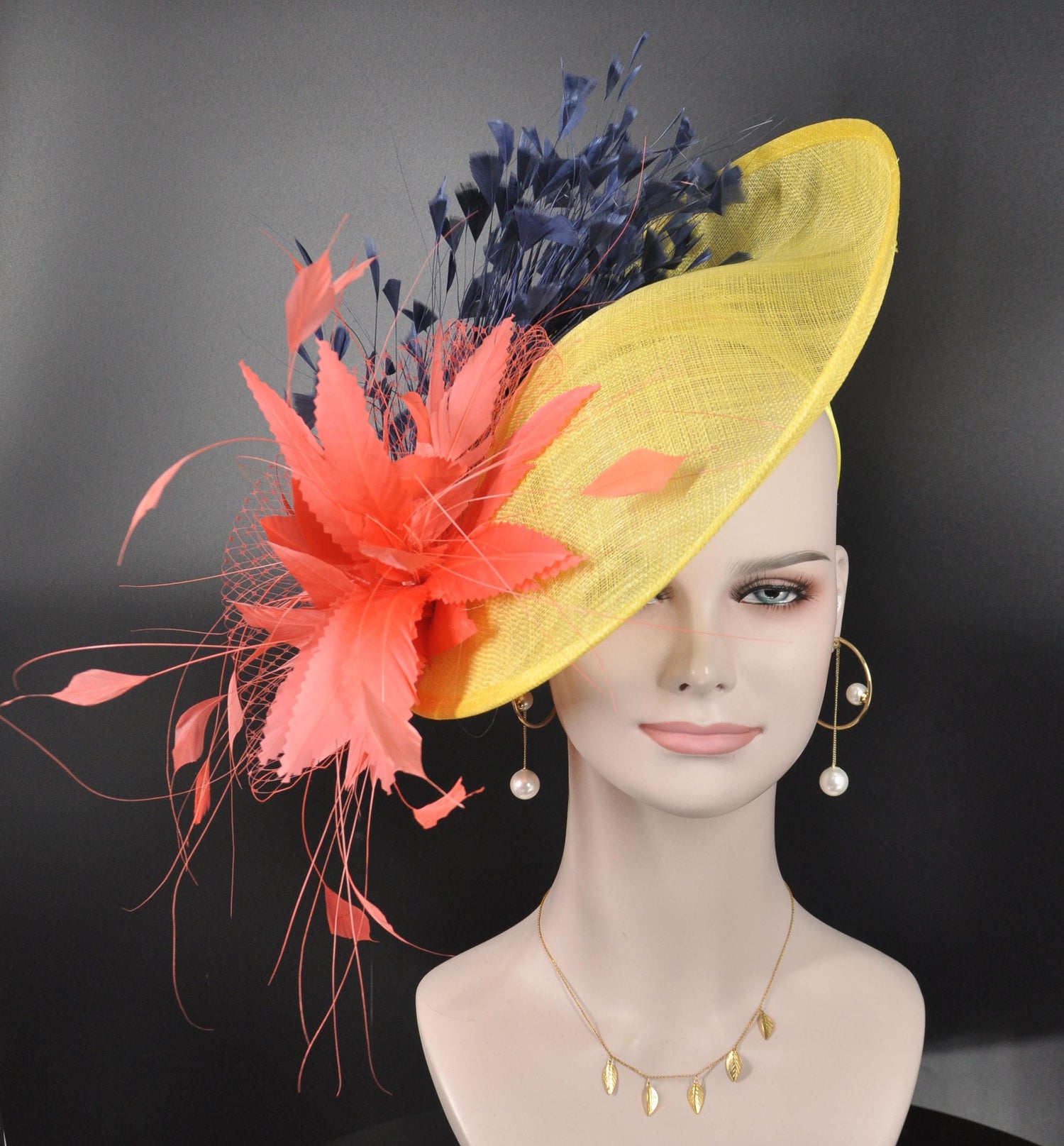Yellow Sinamay Fascinator Hat: Coral Feather Flower, Kentucky Derby