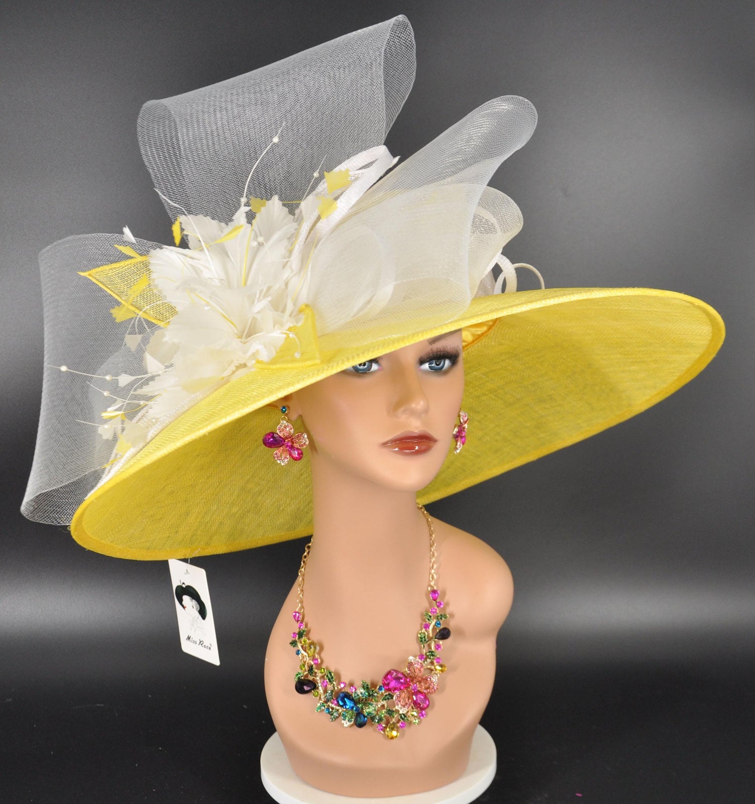 Yellow Sinamay Kentucky Derby Hat: Wide Brim Wedding Tea Party Hat